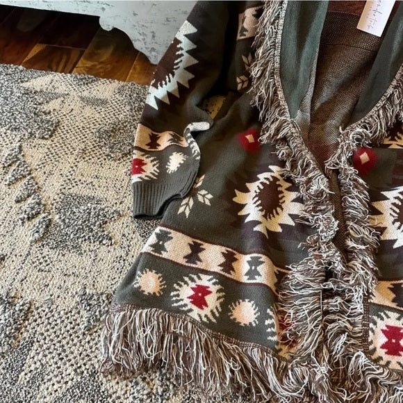 The Bristol Western Print Long Cardigan Sweater in Sage. Featuring the Coziest Native Tribal Inspired Print and a sweet Fringe Hem Blanket Cardigan Sweater Base.
