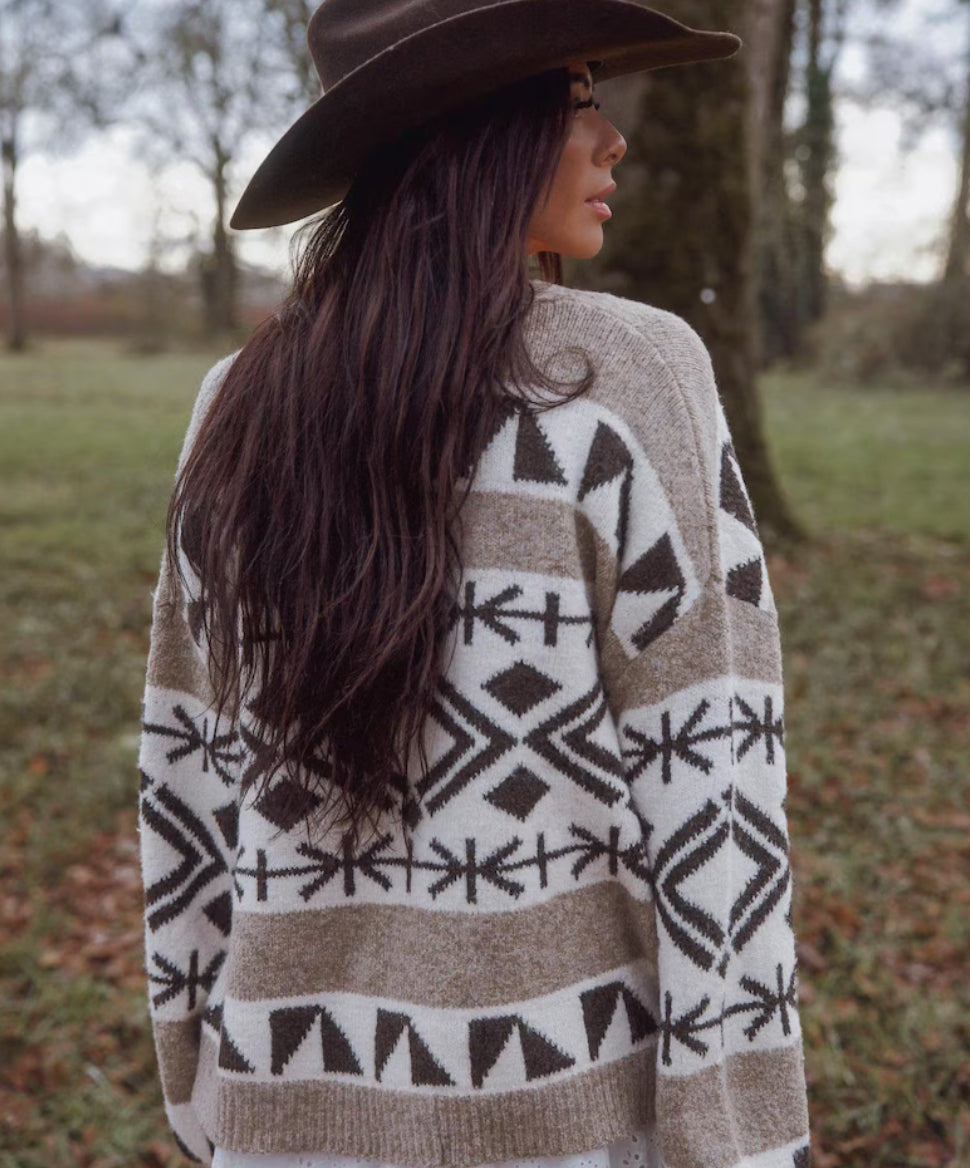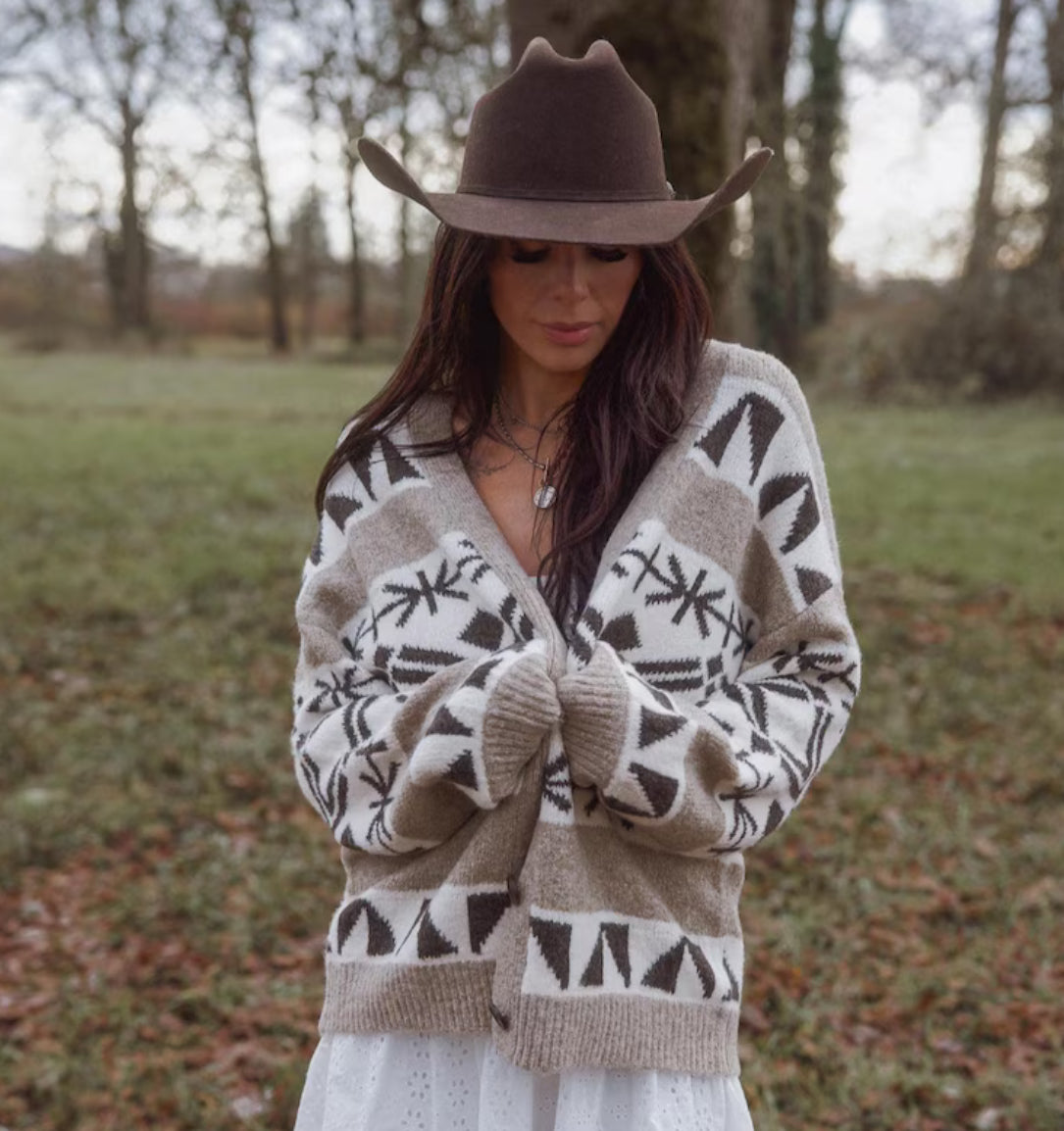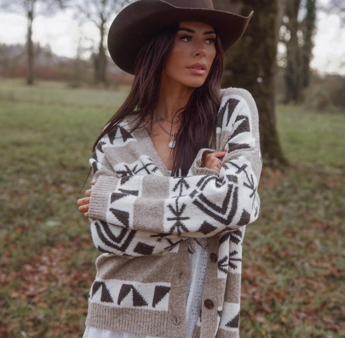 The Bestselling Western Cowichan Knitted Soft Wool Blend Cardigan Sweater - Featuring a Cozy Native Southwest Geometric Aztec Print, Button Front and Cozy Oversized Fit.