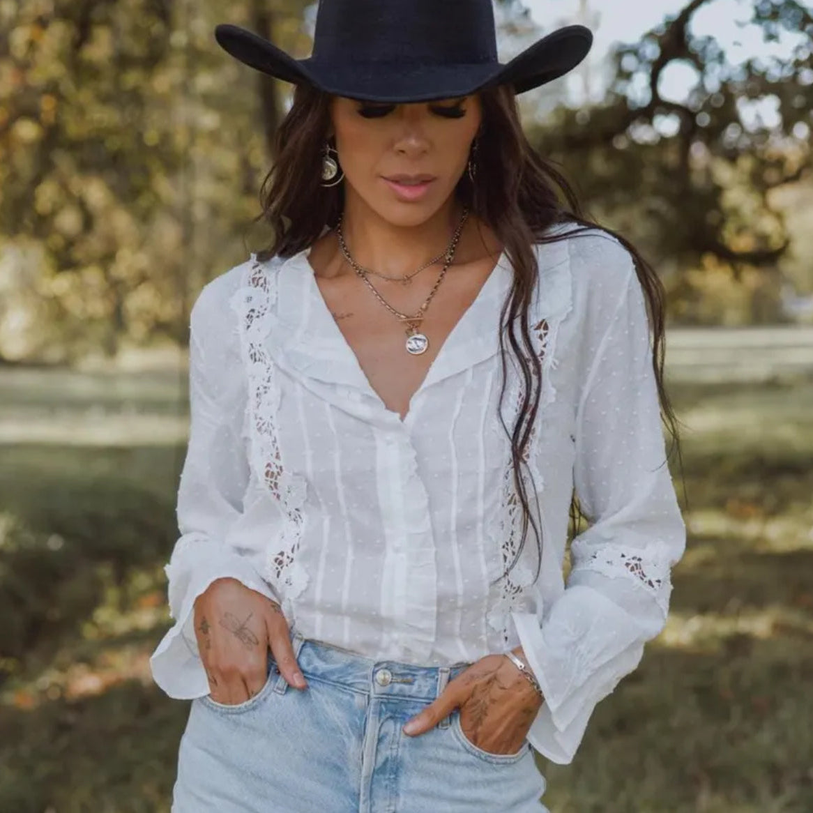 The Harlow Long Sleeve Button Front Lace Blouse.  This pretty blouse features a soft white cotton base, button front, lace floral details and feminine fit.