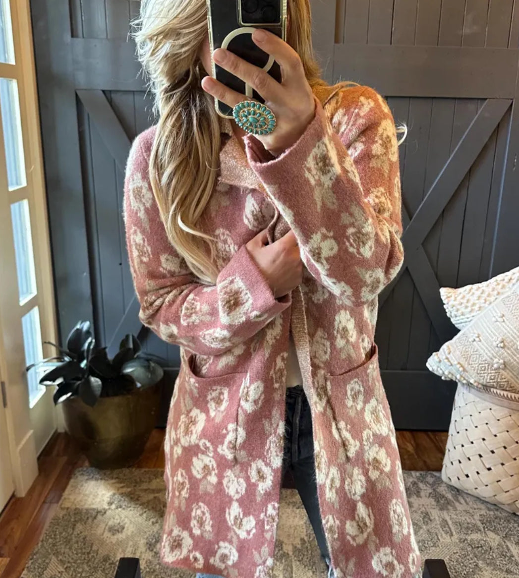 Floral Knit Long Pocketed Cardigan Sweater